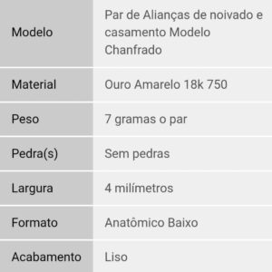 | Modelo: | Par de Alianças de Noivado e Casamento Modelo Chanfrado |